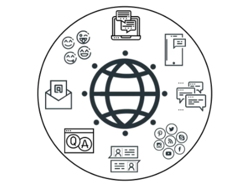 Logo for the ninth Bonn Applied English Linguistics Conference: Black globe with lines for the equator, the poles, and degrees of longitude surrounded by graphics that symbolise online or computer communication such as emojis, message bubbles, an email icon, a laptop, and a phone. The graphics are within another black circle.