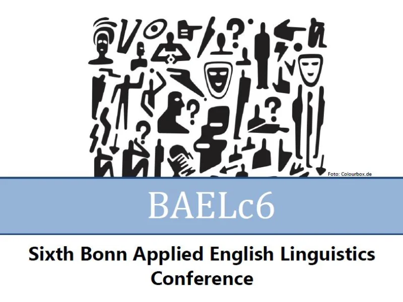 Logo for the sixth Bonn Applied English Linguistics Conference. Black graphics of people, faces, and question marks are arranged in a rectangle above a light blue banner with white writing: BAELc6. Underneath in black writing: Sixth Bonn Applied English Linguistics Conference