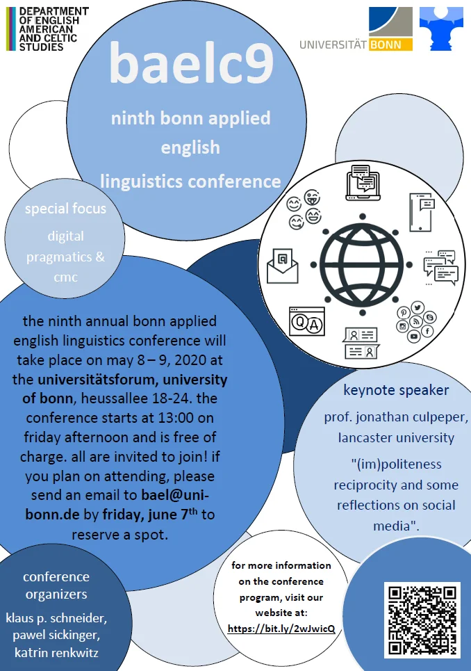 announcement poster for the BAEL conference 2020 with logos of the department of English, American, and Celtic Studies, Bonn University, and BAEL, including a graphic of a symbol of a globe surrounded by symbols of digital communication like text messages, emails, app icons, and emojis. text in blue and gray bubbles: baelc9 ninth bonn applied english linguistics conference special focus digital pragmatics & cmc the ninth annual bonn applied english linguistics conference will take place on may 8 – 9, 2020 at the universitätsforum, university of bonn, heussallee 18-24. the conference starts at 13:00 on friday afternoon and is free of charge. all are invited to join! if you plan on attending, please send an email to bael@uni-bonn.de by friday, june 7th to reserve a spot. keynote speaker prof. jonathan culpeper, lancaster university "(im)politeness reciprocity and some reflections on social media". conference organizers klaus p. schneider, pawel sickinger, katrin renkwitz for more information on the conference program, visit our website at: https://bit.ly/2wJwicQ