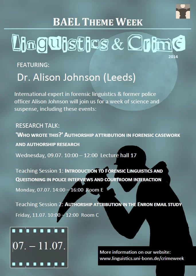 Crime week announcement dusty blue background with a black silhouette of a person holding a knife menacingly text: BAEL Theme Week Linguistics and Crime 2014 Featuring Dr. Alison Johnson (Leeds) International expert in forensic linguistics & former police officer Alison Johnson will join us for a week of science and suspense, including these events: RESEARCH TALK: 'WHO WROTE THIS?' AUTHORSHIP ATTRIBUTION IN FORENSIC CASEWORK AND AUTHORSHIP RESEARCH Wednesday, 09.07. 10:00 – 12:00 Lecture hall 17 Teaching Session 1: INTRODUCTION TO FORENSIC LINGUISTICS AND QUESTIONING IN POLICE INTERVIEWS AND COURTROOM INTERACTION Monday, 07.07. 14:00 – 16:00 Room E Teaching Session 2: AUTHORSHIP ATTRIBUTION IN THE ENRON EMAIL STUDY Friday, 11.07. 10:00 – 12:00 Room C 07. – 11.07. More information on our website: www.linguistics.uni-bonn.de/crimeweek