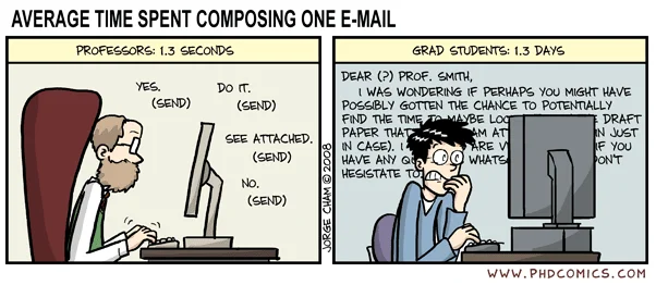 Two frame comic titled 'average time spent composing one email'. The first frame is titled 'Professors: 1.3 seconds' and shows a professor in a big maroon chair writing and sending one to two words long emails in quick succession. The second frame is titled 'Grad students: 1.3 days' and shows a wide eyed, anxious-looking student composing a long, carefully worded email.